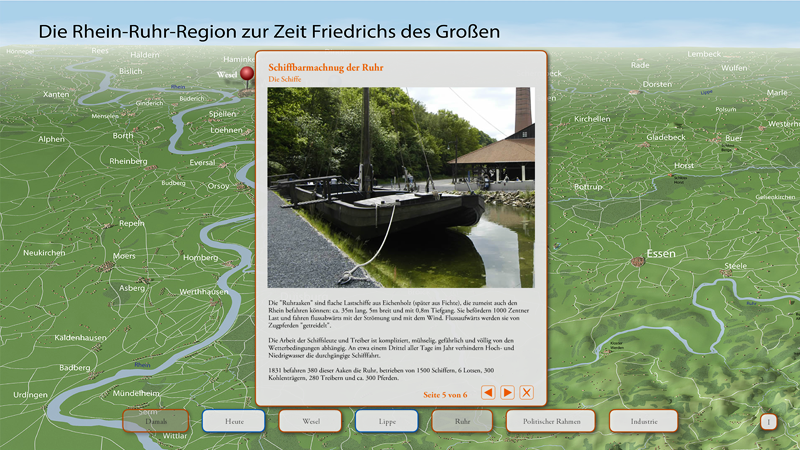 Ein detaillreiches dreidimensionales Panorama veranschaulicht das Ruhrgebiet am Vorabend der Industrialisierung. Der Betrachter kann direkte Vergleiche zwischen damals und heute anstellen, sich über die politische Situation oder die seinerzeit stattfindende Schiffbarmachung der Ruhr informieren.