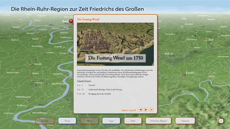 Ausführlich wird über die Festung Wesel berichtet. Dazu wurde ein eigenes dreidimensionales Computermodell erstellt. Kurze Filmsequenzen geben einen Eindruck vom Leben in und neben der damaligen Stadt. Ein Rundgang durch die Zitadellen-Anlagen zeigt, was von jener Zeit heute geblieben ist.